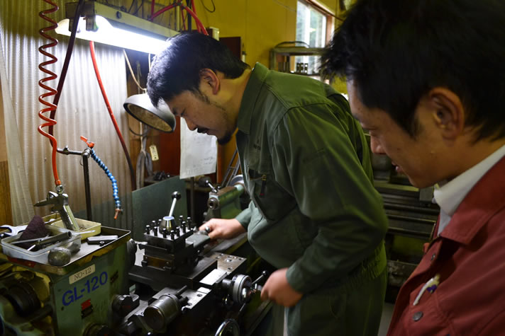 材料となる金属の円柱を設計図どおりに削り出す旋盤(エグロ/GL-120)で作業開始です。